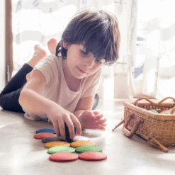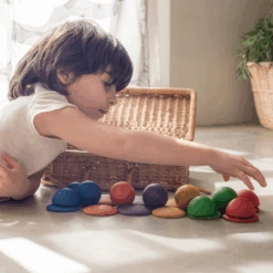 Houten vormenset rond, 30st. (Round) is een set van 30 ronde vormen in 6 kleuren: paars, blauw, groen, geel, oranje en rood van het merk Grapat. Je kunt ze gebruiken om mooie vormen en patronen te maken of om te tellen, sorteren of op de seizoenstafel.