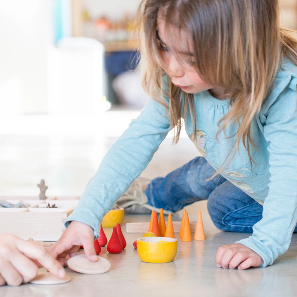 Combineer de houten kegels oranje, 36 st. (Mandala orange code) met ander houten speelgoed van Grapat om nog mooiere en dynamischere vormen en patronen te maken.