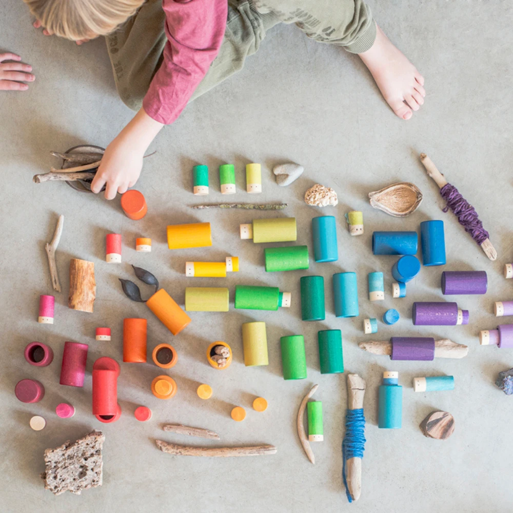 Combineer Houten poppetjes Lola gekleurd, 72st. (Lola) met ander houten speelgoed van Grapat om nog mooiere en dynamischere vormen en patronen te maken.