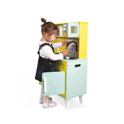 Keuken Happy Day, volledig van hout, met haken om een metalen lepel op te hangen, een metalen braadpan, een metalen vergiet, een pothouder en 3 kartonnen voedseldozen (pasta, melk en erwten).