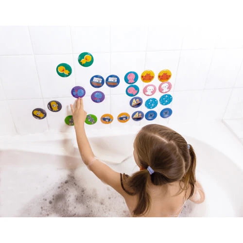Geheugenspel met 24 kaarten van schuimrubber die op het water drijven, ideaal om mee in het bad te spelen. Pure magie! Week de stukken in het water om ze op de badrand of tegels vast te maken.