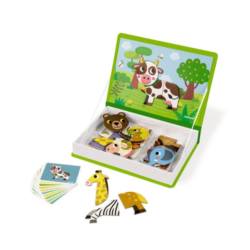 Met Magnetibook dieren van Janod maak je bekende dieren in een handige magneetdoos. Welke onderdelen horen bij de koe? En de strepen.. zijn die van de big of de zebra?