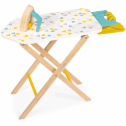 Houten strijkplank incl. hangers en strijkijzer voor kinderen tussen 3 en 8 jaar. Ideaal om kleertjes van de poppen mee kreukvrij te maken. Verstelbaar in hoogte om aan te passen naar de grootte van jouw kind. Bijgeleverde strijkijzer bevat geluidsknop.