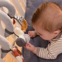 Ahoy, kleine matroos! Elke dag wordt een nieuw avontuur in de baai met deze uitnodigende activiteitenspiraal. Dit uitdagende speelgoed is gemaakt van katoen en corduroy en heeft verschillende speeltjes, waaronder een zeemeeuw, een zeilboot en een reddingsboei met verschillende leuke labels en een spiegeltje voor zelfontdekking. De spiraal stimuleert de eerste hand-oogcoördinatie van je kleintje en zorgt voor urenlang vermaak. Je kunt hem gemakkelijk bevestigen aan de box, een autostoeltje of kinderwagen.