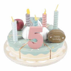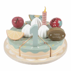 De set bestaat uit 6 stukjes taart op een plateau, een taartschep, kaarsen, slagroomtoefjes en cijfertoppers. Geverfd met kindvriendelijke verf op waterbasis.