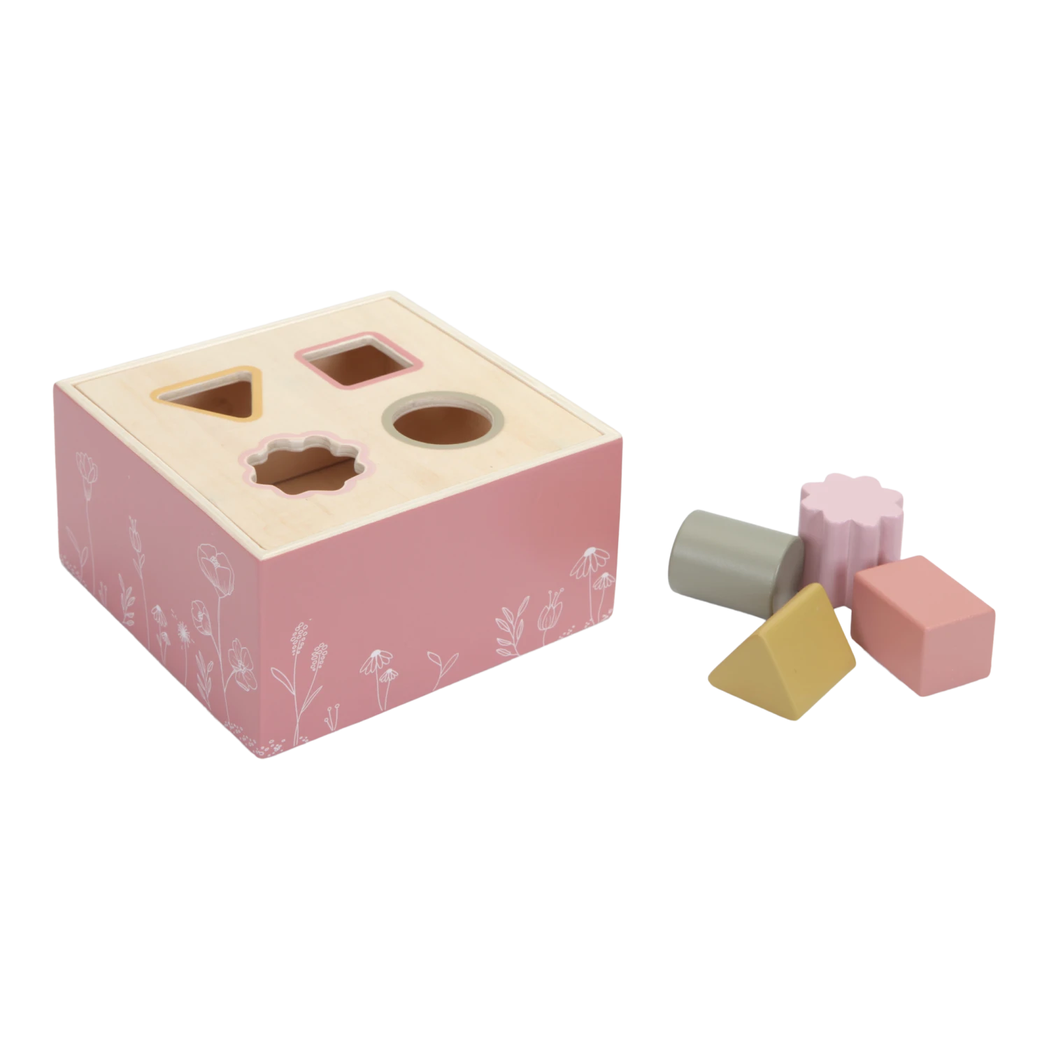 Vrolijke houten vormenstoof van Little Dutch met illustraties van bloemen. De kubus heeft 4 verschillende openingen waar vormen naar binnen worden geduwd. Deze vormenstoof stimuleert de oog-handcoördinatie en leert je kindje vormen herkennen.