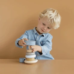 Houten speelgoed – tuimelringpiramide oceaan blauw (Ocean Blue) is een houten stapeltoren in blauwe kleuren van het merk Little Dutch. De stapeltoren heeft een afgeronde vorm aan de onderzijde, waardoor het direct een tuimelaar is.