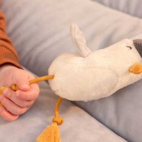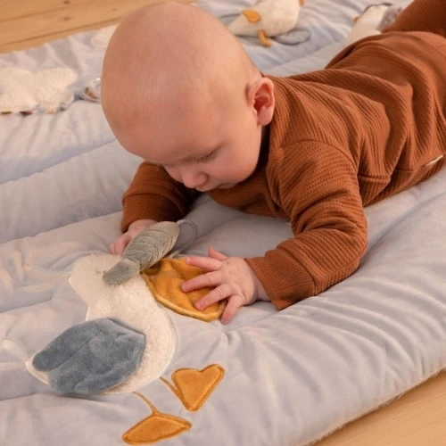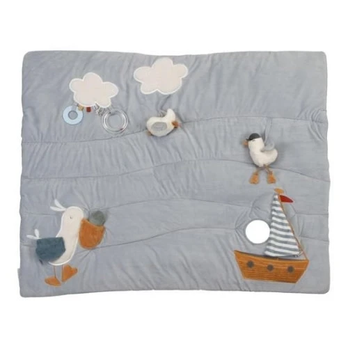 Kleine handjes, grote ontdekkingen. Dit zachte, op de haven geïnspireerde boxkleed stimuleert met verschillende texturen en activiteiten de zintuiglijke ontwikkeling. Je kindje zal de ene na de andere leuke verrassing ontdekken. Van een zeemeeuw die piept als er in hem genepen wordt, tot een pelikaan met knispervleugels en een visje in zijn snavel. Een van de wolkjes heeft een doorzichtige ring die rammelt als je baby ermee speelt. En achter het gestreepte zeil van de zeilboot is een spiegeltje voor zelfontdekking verstopt.