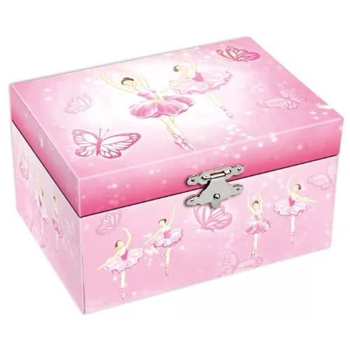 Prachtig roze sieradendoosje voor kinderen. Dit muziekdoosje, sieradendoosje is roze en versierd met ballerina’s. Perfect voor het opbergen van kindersieraden. Open het doosje en zie hoe de ballerina danst op de muziek.
