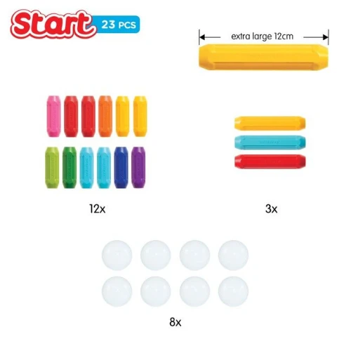 Deze set bevat 23 speelstukken: korte en lange staven & metalen ballen. Genoeg om tal van 2D of 3D figuren te gaan maken. Met het bijgeleverde instructieboekje zetten we jullie alvast op gang. Alle onderdelen kan je met elkaar verbinden en klikken heel eenvoudig in elkaar dankzij de magnetische staven en metalen balletjes.